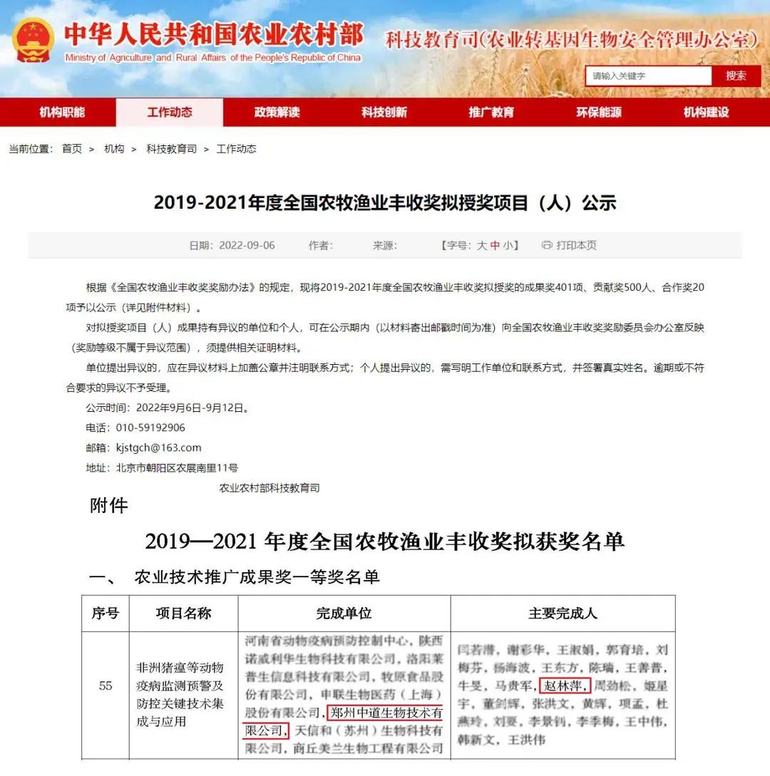 中道生物讯 9月6日,中华人民共和国农业农村部官方网站发布了关于“2019—2021年度全国农牧渔业丰收奖拟授奖项目(人)公示”及拟获奖名单,郑州中道生物技术有限公司荣获该奖项一等奖!