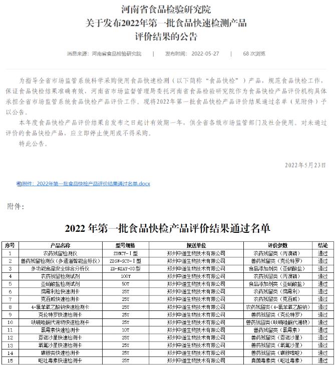 经过几个月的严格评价验证,郑州中道生物技术有限公司自主研发生产的农药残留检测仪,兽药残留检测仪(多通道智能金标仪),多功能食品安全综合分析仪,农药残留、兽药残留、非法添加物质、真菌毒素等快检试剂及检测卡,于2022年5月27日顺利通过河南省食品检验研究院2022年第一批食品快速检测产品评价。